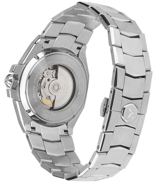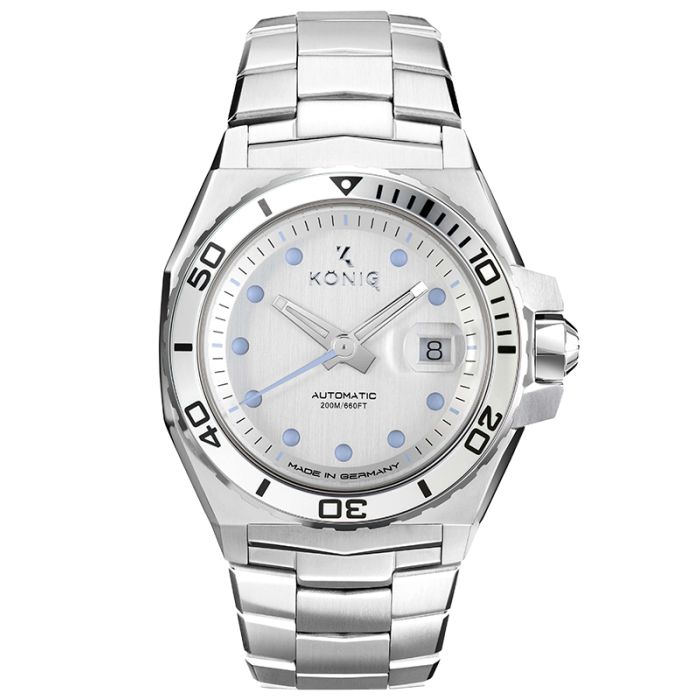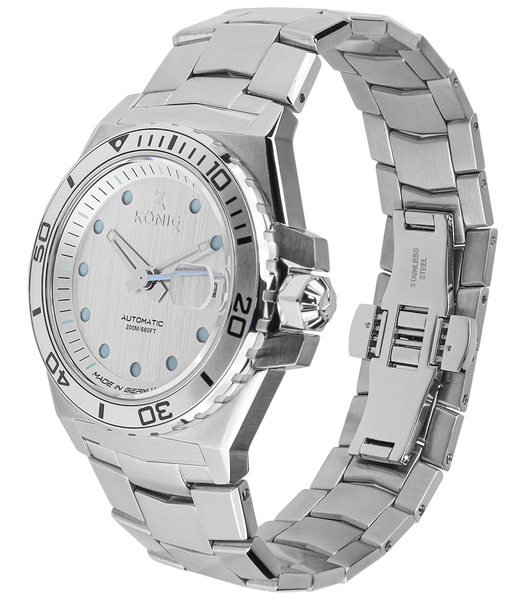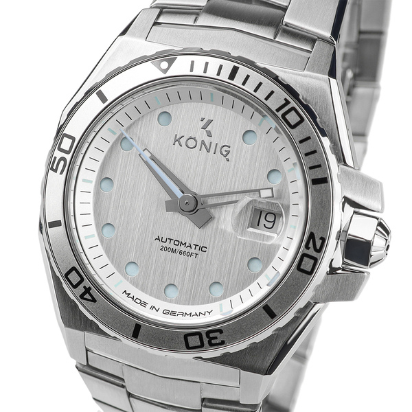 Czasomierz jest pełnoprawnym diverem, oferując wodoszczelność na poziomie 200m, co umożliwia pływanie z zegarkiem, a nawet nurkowanie na niewielkich głębokościach. Wszystko to zasługa solidnej, srebrnej koperty ze stali szlachetnej odpornej na uszkodzenia mechaniczne oraz korozję. Dodatkowo, na boku obudowy znajduje się zakręcana koronka, pomagająca w uszczelnieniu urządzenia. Tarczę okala srebrny, obrotowy bezel, ułatwiający pomiar czasu zanurzenia. Całość zaprezentowano na srebrnej, stalowej bransolecie odpornej na uszkodzenia i efekty korodowania.