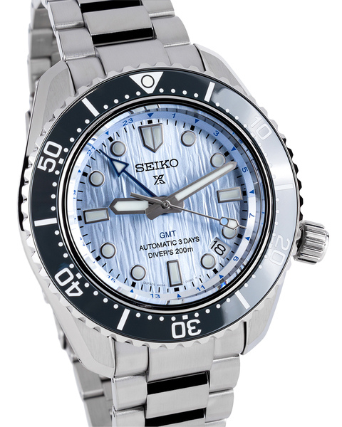 Co pierwsze przyciąga uwagę w tarczy zegarka Seiko Prospex Watchmaking 110th Anniversary Save the Ocean Limited Edition SI SPB385J1 to kolorystyka i faktura jej powierzchni, skutecznie symulującej strukturę ściany lodowca. Poruszające się po niej smukłe, srebrno-białe wskazówki celują kolejno w proste, podłużne i okrągłe indeksy o jasnym ubarwieniu. Dodatkowa, niebieska wskazówka służy tu jako funkcja GMT, możesz zatem ustawić dodatkowo godzinę innej strefy czasowej. Pomiędzy indeksami godzin 4 i 5 widnieje okienko datownika, z którego wyczytasz bieżący dzień miesiąca. Od strony wierzchniej czasomierz zamyka szkiełko szafirowe, o niezrównanej odporności na zarysowania i uszkodzenia.