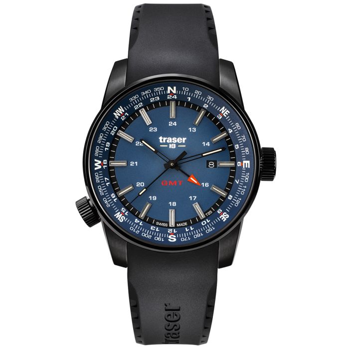 Tarcza zegarka ma piękny granatowy kolor, który kontrastuje z białymi cyframi arabskimi, logotypem i skalą kompasu na pierścieniu. Wskazówka drugiej strefy czasowej wyróżnia się czerwonym grotom, który ułatwia odczyt. Zegarek posiada funkcję GMT, która pozwala na jednoczesne sprawdzanie czasu w dwóch strefach czasowych na Ziemi. Jest to bardzo przydatna opcja dla osób, które często podróżują lub mają kontakt z ludźmi z innych krajów. Zegarek ma również datownik, który pokazuje dzień miesiąca. Zegarek ma również unikalną technologię podświetlenia Trigalight®, która polega na zastosowaniu szklanych rurek wypełnionych gazem H3, który świeci samoczynnie przez 25 lat. Rurki znajdują się na wskazówkach i indeksach na tarczy oraz na logotypie. Dzięki temu zegarek jest widoczny w każdych warunkach oświetleniowych, nawet w całkowitej ciemności. Technologia Trigalight® jest bezpieczna dla zdrowia i środowiska, a także nie wymaga żadnego zewnętrznego źródła zasilania. Szkło zegarka jest wykonane z antyrefleksyjnego szkła szafirowego, które jest bardzo odporne na zarysowania i uszkodzenia. Dodatkowo, szkło jest otoczone fluorescencyjną uszczelką, która tworzy efekt aureoli wokół tarczy, gdy zegarek znajduje się w ciemnym miejscu.